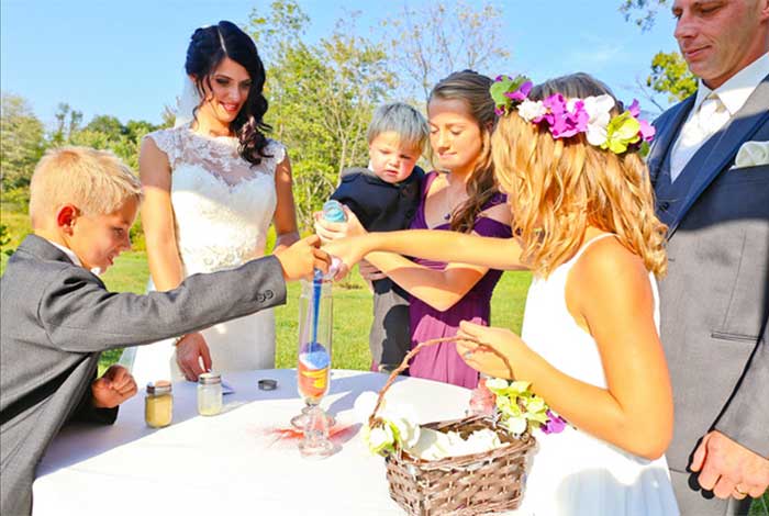 One of the special parts of this wedding that the couple celebrated was the blended family that was coming together. This was captured with a sand ceremony with the couple, the groom’s two kids, and the bride and groom’s 2 year old literally blending the sand into this wonderful artistic expression. Also, one of the most touching parts of their ceremony was when the bride knelt down and said her custom vows and promises to the the groom’s children.