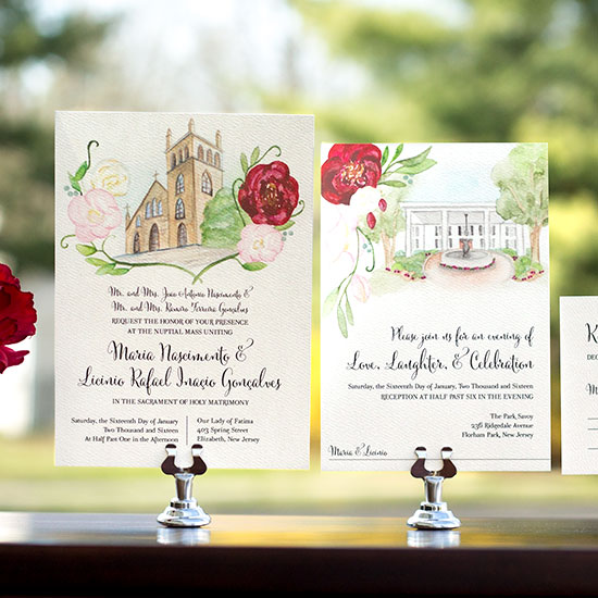 Manuela also wanted to make sure the classic Cartagena street and cathedral was on her wedding invitation. But the main focus of her Cartagena wedding invitation was her wedding venue, the historical showstopper, Hotel Charleston Santa Teresa. With her main wedding color being gold, we splurged for the gold foil lettering on the invitation which really elevated the entire invitation set. Cartagena is a very colorful city in Colombia so I was fortunate enough to get to paint many of the colorful elements in this invitation set.