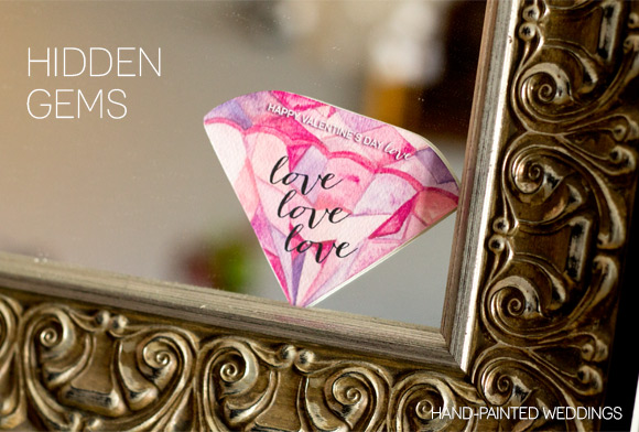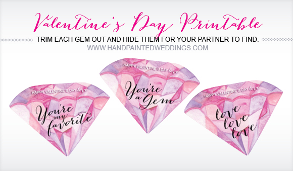 This Valentine’s Day do something special for your partner. This project is easy, free and lasts all day! Here is the trick…you download these printable gems hand-painted by yours truly, trim them out and hide them in places you know your partner will find. I’d recommend printing out a few sheets so you have many gems to hide. Want to take it to the next level? Write a love note on the back of each gem.