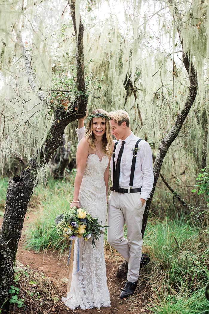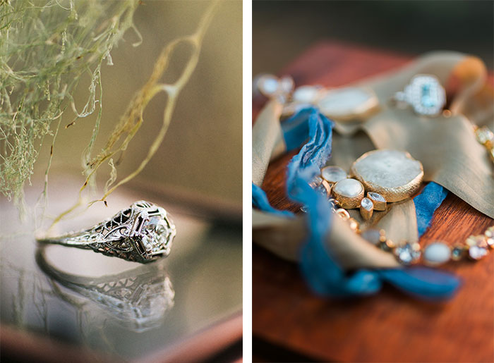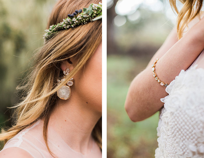 There was just too many dreamy wedding details in this styled shoot to fit into one blog post, so today I’m featuring more of the wedding accessories such as the stunning lace BHLDN wedding dress, the beautiful ring from Trumpet and Horn and bridal jewelry from BHLDN, the boho floral crowns by Emlily Floral, and of course, the watercolor wedding invitation set by yours truly. By the way, the Mystical Forest watercolor wedding invitation is available in the Hand-Painted Weddings Shop.