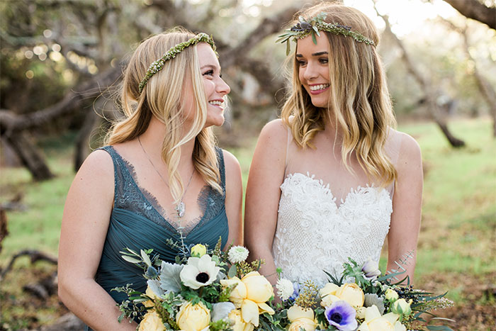 I’m also swooning of the casual, wispy wedding hair the bride and bridesmaid have with their floral crowns. It is so delicate and effortlessly beautiful. The color of blue in the bridesmaid dress is perfection. It has a hint of earthiness to it, while still be classically blue, which is apparently the most popular color for bridesmaid dresses in the U.S.