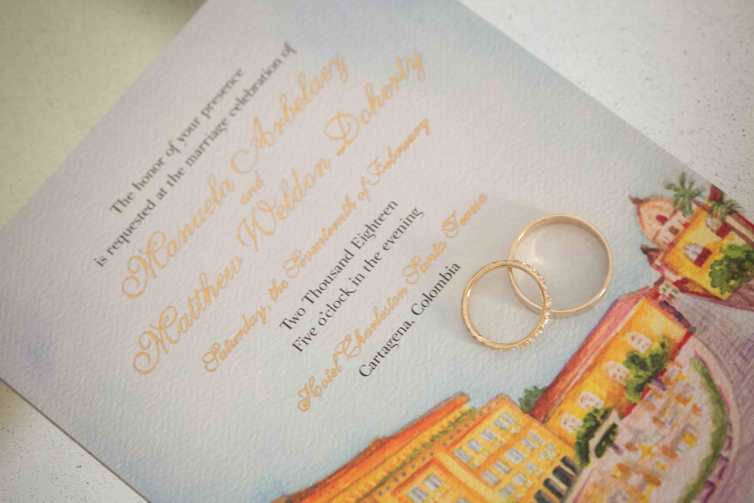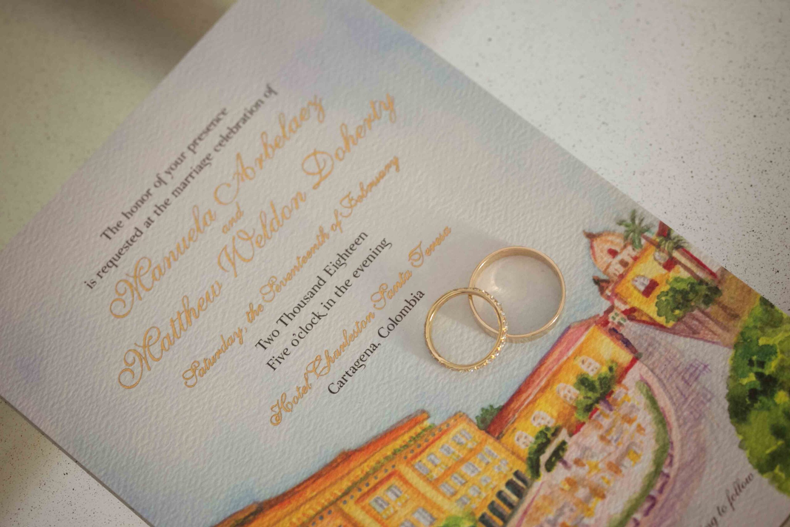 Manuela also wanted to make sure the classic Cartagena street and cathedral was on her wedding invitation. But the main focus of her Cartagena wedding invitation was her wedding venue, the historical showstopper, Hotel Charleston Santa Teresa. With her main wedding color being gold, we splurged for the gold foil lettering on the invitation which really elevated the entire invitation set. Cartagena is a very colorful city in Colombia so I was fortunate enough to get to paint many of the colorful elements in this invitation set.