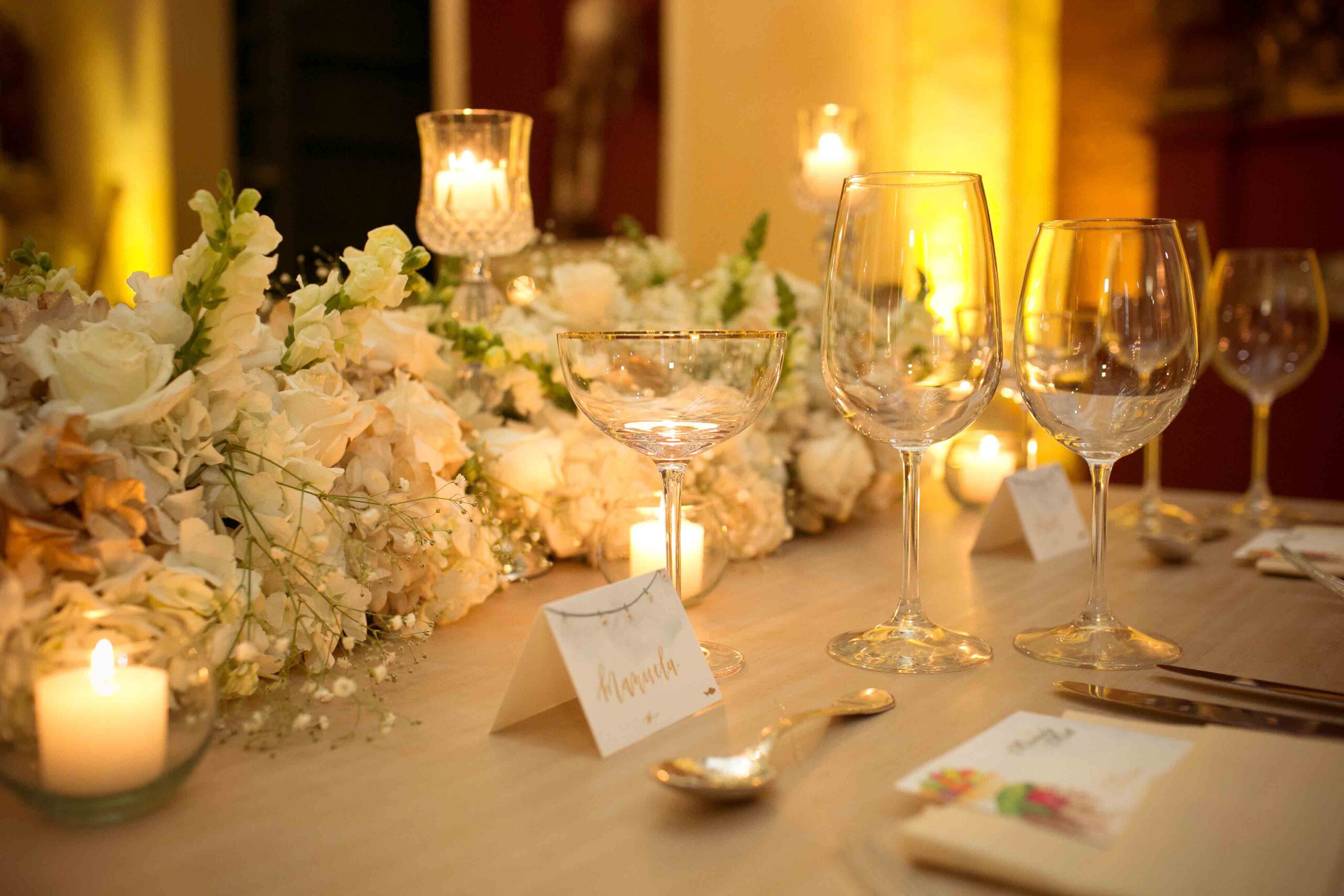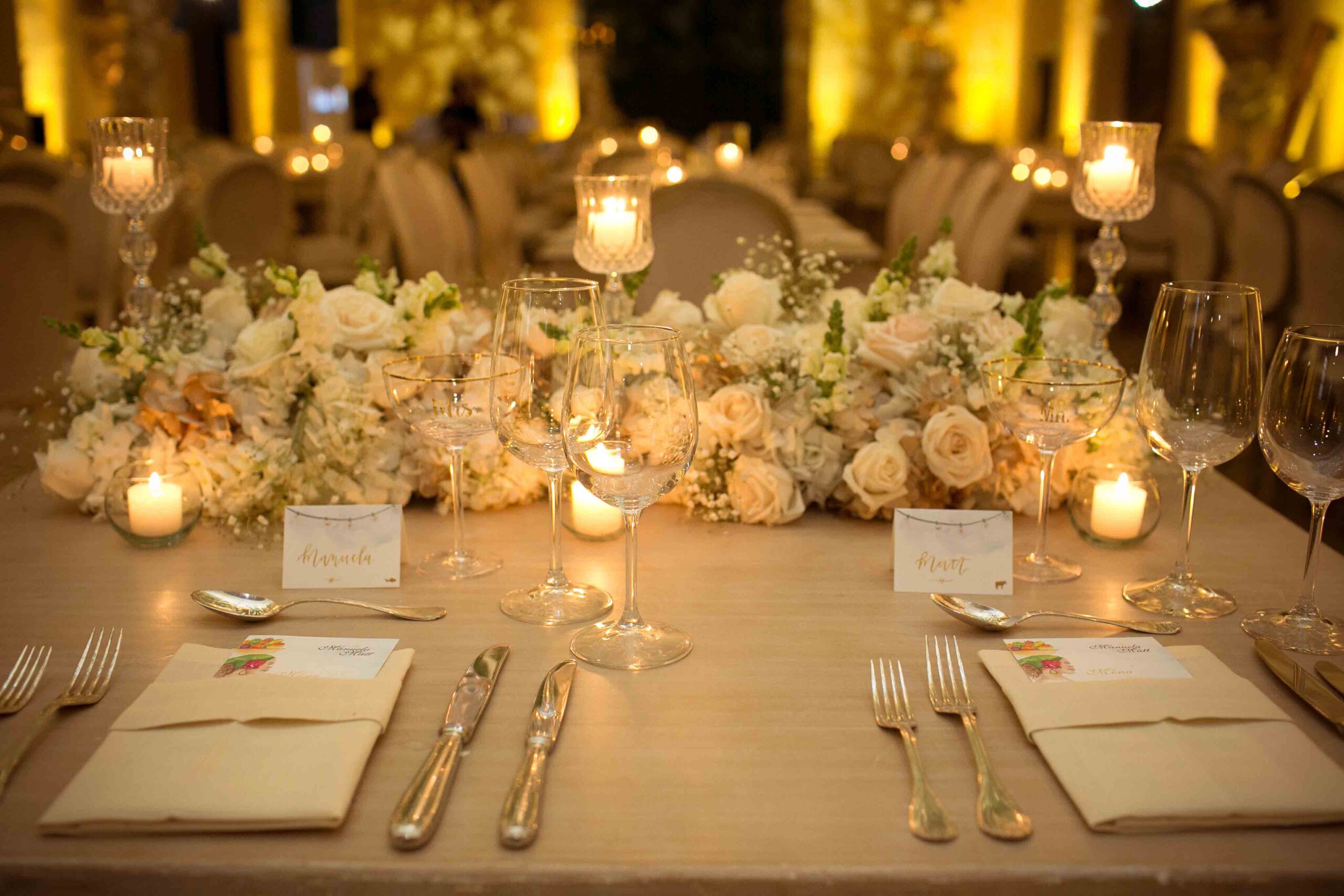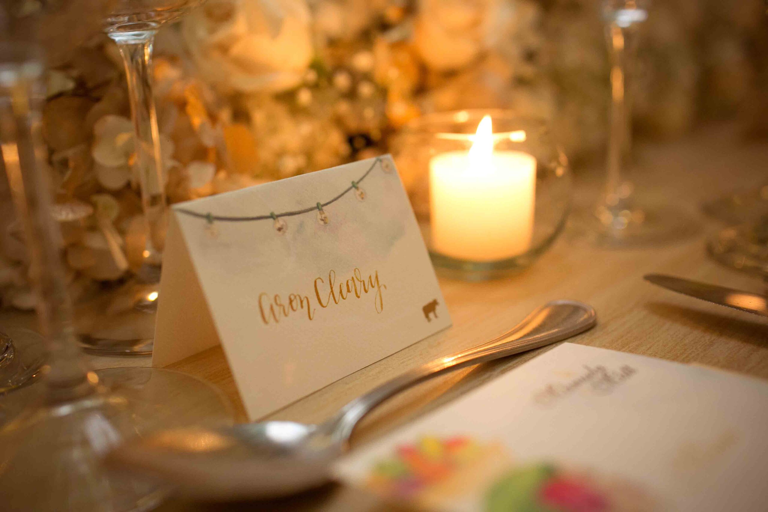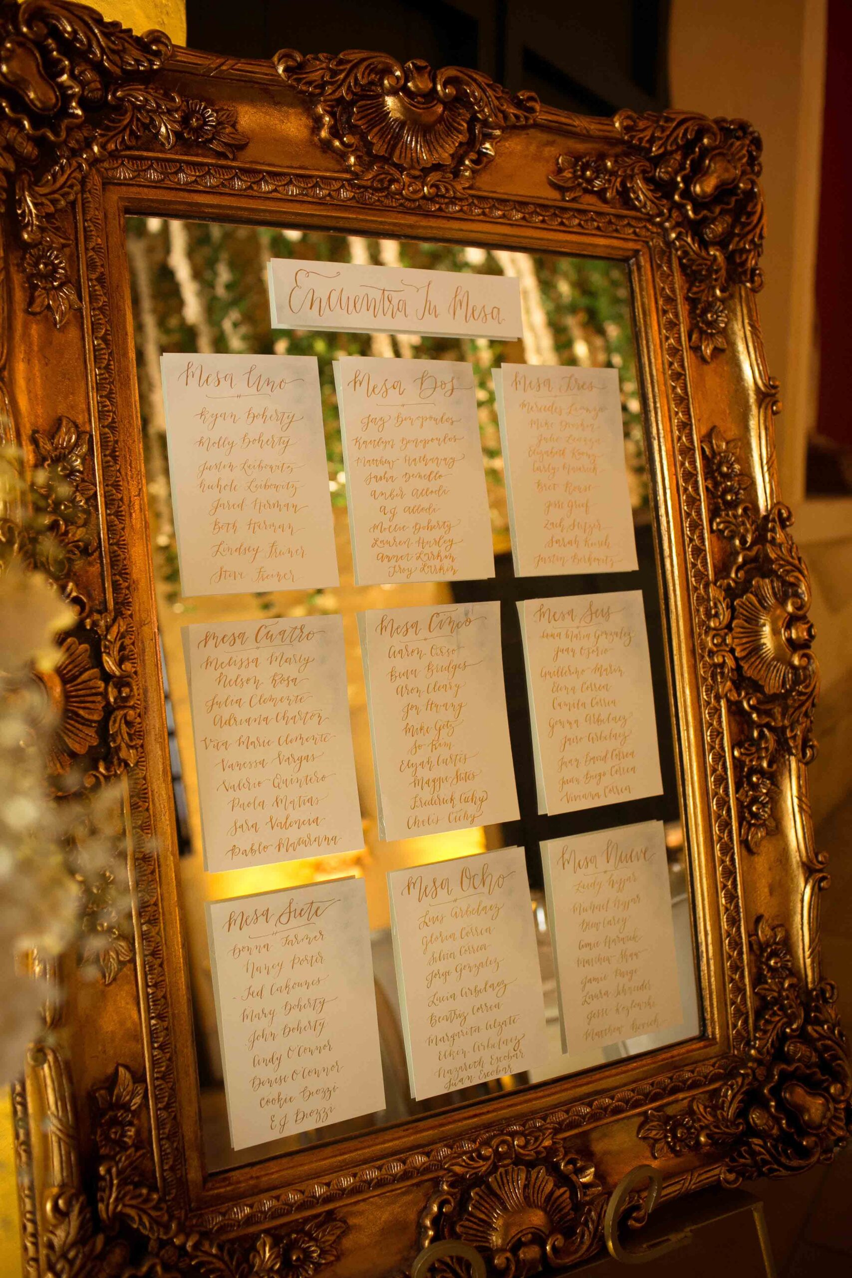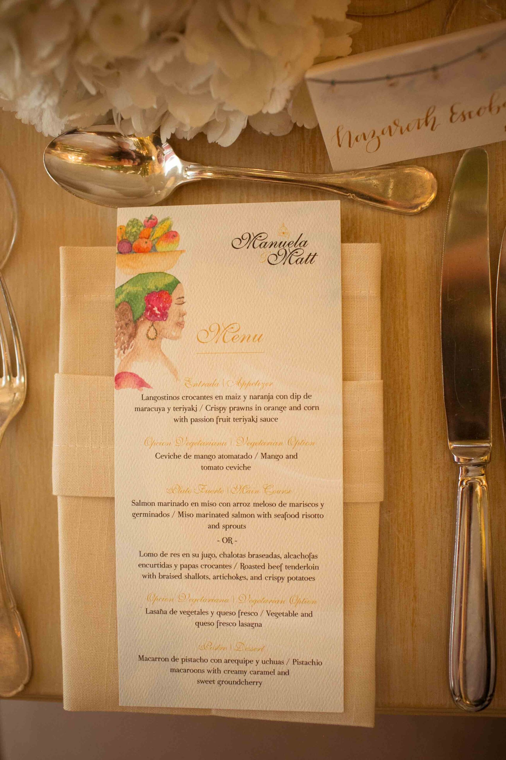For Manuela’s wedding day paper, we worked together on her menus, which featured a local Colombian woman with a basket on her head carrying fruits and vegetables from the menu the guests were about to enjoy. The place cards tied in with the Wedding Particular card from the invitation set and featured string light and a soft blue background. String lights hung outside from the cocktail hour location so it was a perfect detail to include. I then worked with one of my friends, Letters by Kristen to do hand calligraphy on all of the place cards in metallic gold ink. These matched the seating arrangement cards we worked together on which hung on top of an antique gold framed mirror for guests to figure out where they were going to sit during the reception. I have to say, it was pretty fun doing the famous Drew Carey’s seating card!