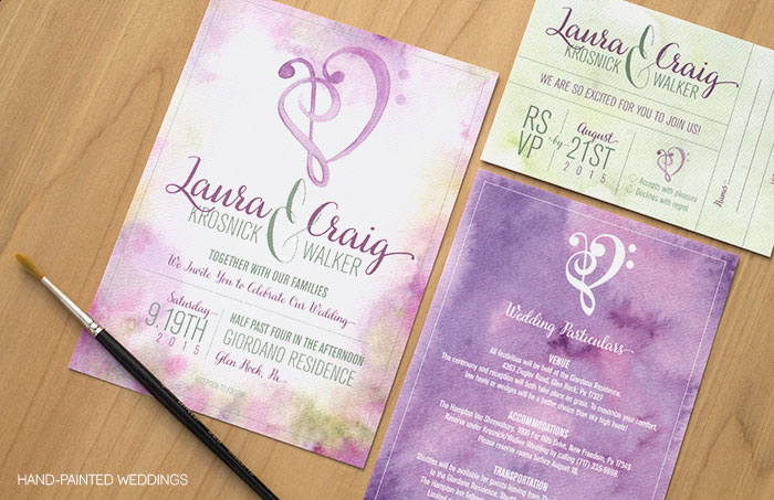 Laura: The Hand-Painted Wedding touches captured the the rustic elegance I was going for. Purples and greens were bled together in a simple, understated elegance as the backdrop for my wedding invitations, escort cards and personalized thank-you cards at each place setting. I chose the Country Cobblestone thumbprint guest book which was perfect because it looked just like the dirt road behind the alter at our backyard country wedding. I hand made almost every decoration in the wedding and so I really appreciated the originality and the beauty of the Hand Painted wedding paper. Allison Krosnick is so talented and I feel so lucky to call her my sister.