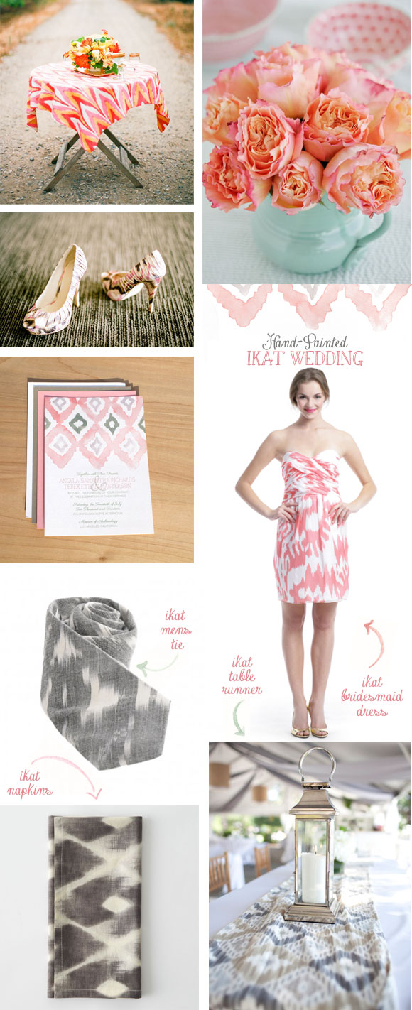 A hand-painted ikat wedding is feminine and fun. It is loose and cheerful. Perfect for a spring or summer wedding, but could easily translate into fall with a few color palette adjustments.