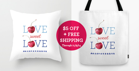 Through tomorrow, 11/9/14 there is a $5 off plus free shipping deal going on, making it only $17 for a Love Sweet Love tote, and only $15 for a throw pillow cover (free shipping)!! That is a great deal.