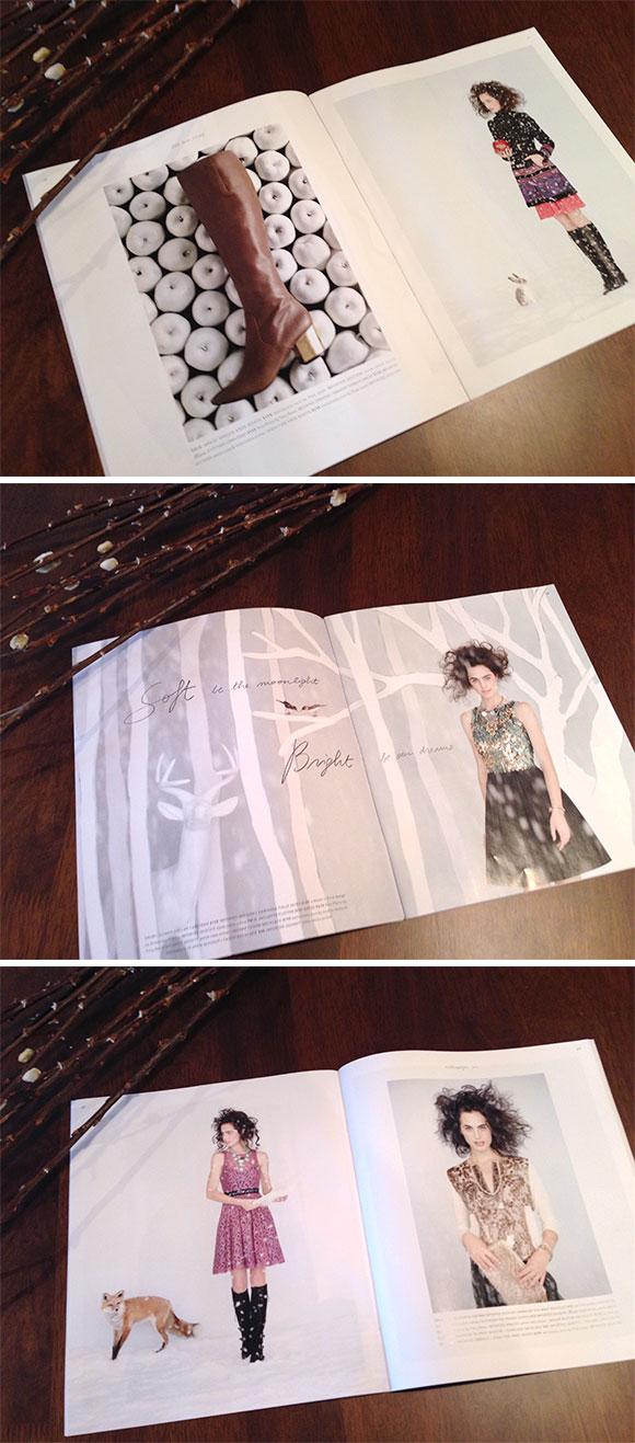 The other element I love about this catalog are the handmade pieces. The paper trees interspersed with the pencil script writing. They are the perfect accents to this beautiful fantasy.