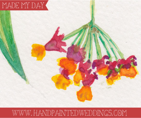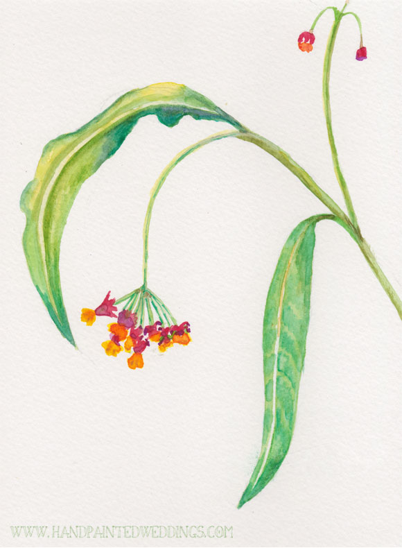 Anyways, back to the farmer’s market…there was a lovely vendor selling bouquets of wild flowers mixed with sunflowers and zinnias. The bouquets looked so cheerful, I had to have one. Unfortunately, the bouquet didn’t last long but I was able to get a painting of these small red flowers I had never seen before as the leaves started to wilt. I am loving how this painting resembles botanical watercolors in it composition.