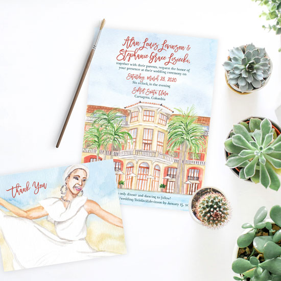 This luxury wedding invitation suite was inspired by the vibrant beauty of Cartagena, Colombia, and the historic charm of the Sofitel Hotel Santa Clara. The hand-painted watercolor design captures the essence of this tropical destination, featuring lush foliage, colorful blooms, and intricate architectural elements that reflect the grandeur of the venue. Rich, warm colors and elegant calligraphy combine to evoke the romance and cultural vibrancy of a Cartagena wedding, offering guests an unforgettable first glimpse into the celebration.