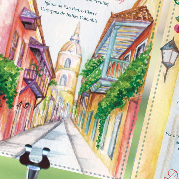 The watercolor Cartagena wedding invitation is perfect for a destination wedding in Cartagena, Colombia. The Cartagena wedding invitation features a prominent street in town. The wedding particulars card features a standard Cartagena door with flowers hanging above the door. The RSVP card features string lights and a gold background.