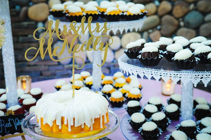 There beautiful sweetheart table complete with lit Mr. & Mrs. letter signs and a low bouquet of peonies I’m sure got (even) more splendid as the sun set into night. Behind their sweetheart table they had a sweets table complete with varying cupcakes on adorable cake stands and a little cake with a laser cut Mr. & Mrs. cake topper.