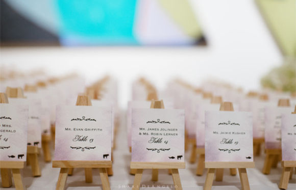 Both the menu cards and the escort cards featured this beautiful, soft purple watercolor wash I painted to match the uplighting at their reception. The escort cards were so much fun; they were inspired by the easel escort cards Truly You Events and I did at the styled shoot last year. I was so excited to see how the escort card easels came out for this gorgeous real wedding. They are the perfect compliment to an art gallery wedding!