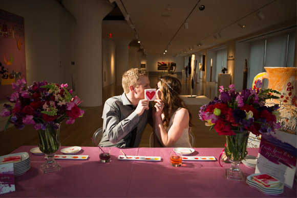 One of my favorite touches are the escort card easel signs (bride and groom shown in photo 1). I love how fitting they are for the gallery theme, and how they look set up in front of each dinner plate. Sprinkling paint brushes is also a nice touch to bring together the painterly theme. The flower arrangements and the bouquets by Beautiful Blooms coordinate so well with this wedding and are truly gorgeous. There were even edible flowers in the entree.