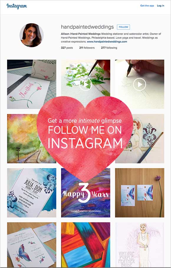 Are you following me on Instagram? If you want to catch a more intimate glimpse of the behind the scenes at Hand-Painted Weddings, then you should definitely follow me on Instagram. I’m spending a lot of time narrowing down my focus on Instagram to include photos and videos that Hand-Painted Weddings followers would enjoy and many of these sneak peeks are exclusively shared on Instagram.