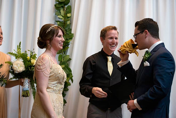 Shannon: We had a unity cocktail! We wrote the ceremony ourselves, and we really wanted our personalities to shine through. Other couples opt to light a unity candle, or combine sand, or some other variation on the unity theme. Well, anyone who knows us knows that Bryan loves beer, and I love whisky. And what goes better together than beer and whisky! So we combined the two in a unity cocktail, and I dropped my shot of whisky into Bryan’s glass of stout. We each then took a sip. (It was a huge hit with the guests!)
