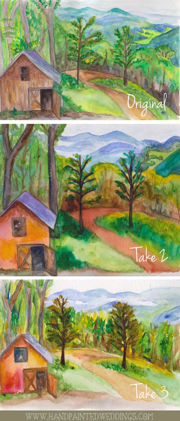 In this painting series, I start off by showing you the original painting I created at the lodge this past weekend. This was the view from the deck looking off onto a barn and, in the distance, the Blue Ridge Mountains. The second two paintings (Take 2 and 3) were created using the original painting as a guide. You can see that I got a little bit more loose as I continued to revisit the same painting (ie. Take 3). There are things I like about all three of the paintings. I love the texture in the barn from the original painting. I love the bark on the large trees behind the barn on “Take 2”. I love the tree textures, the bright colors, and the mountains in “Take 3”.